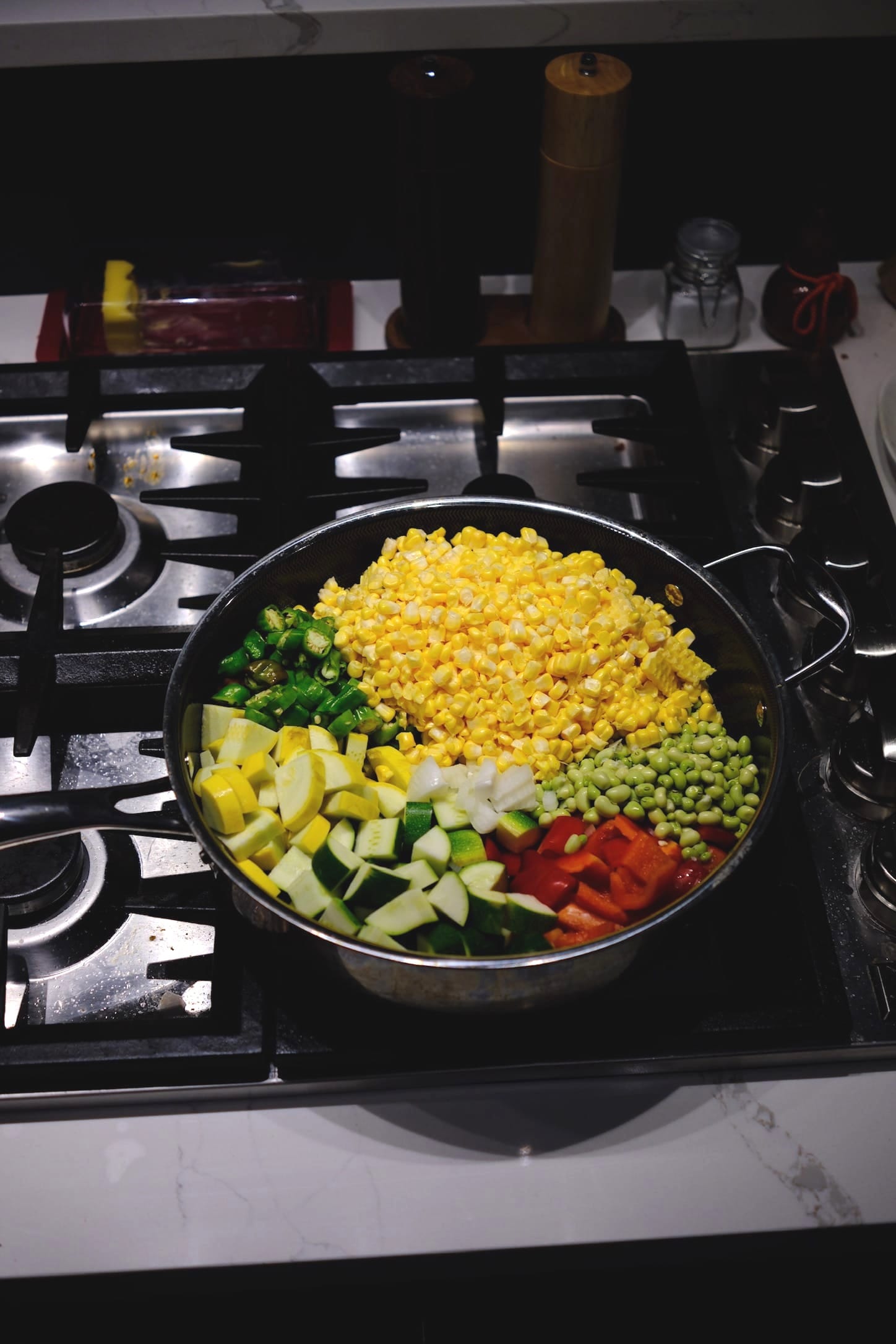 Here in Georgia, zipper peas were on sale and grown locally. However this was the first time I have shelled peas myself, and it occurred to me that it must be the reason people have chosen to have children over the course of history. Definitely pawn that job onto someone else if you are able, but if not, frozen peas or beans will certainly work great. You can mix and match the vegetables to your taste and to the season, but beans, corn, and squash make a great base. I've been growing shishitos this year as well, and there is a huge difference in the flavor between store bought and home grown. I know that applies to pretty much everything, but man it really applies to shishitos. I also added some garden tomatoes, and the little pops of flavor were a tomato girl's dream.