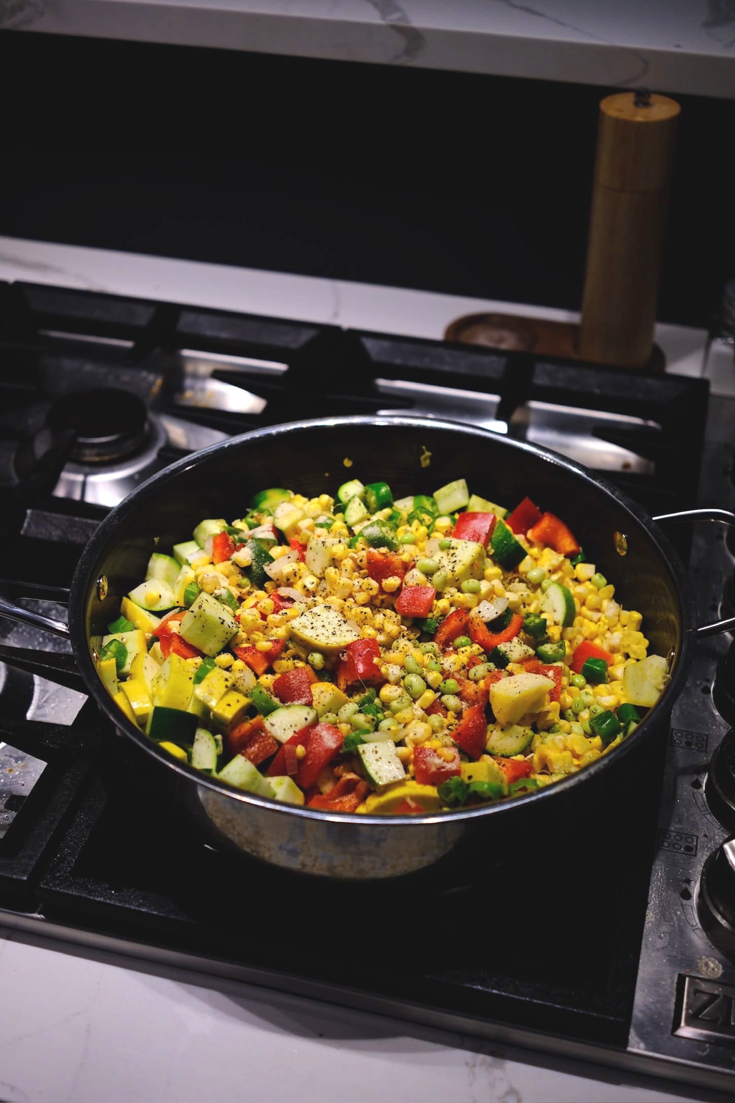 This recipe is a true celebration of the bounty of September, with squash, corn, tomatoes, peppers, beans, zucchini, and fresh herbs. And honestly, it has no right to be so delicious considering it is just a big pot of mixed vegetables (and butter).