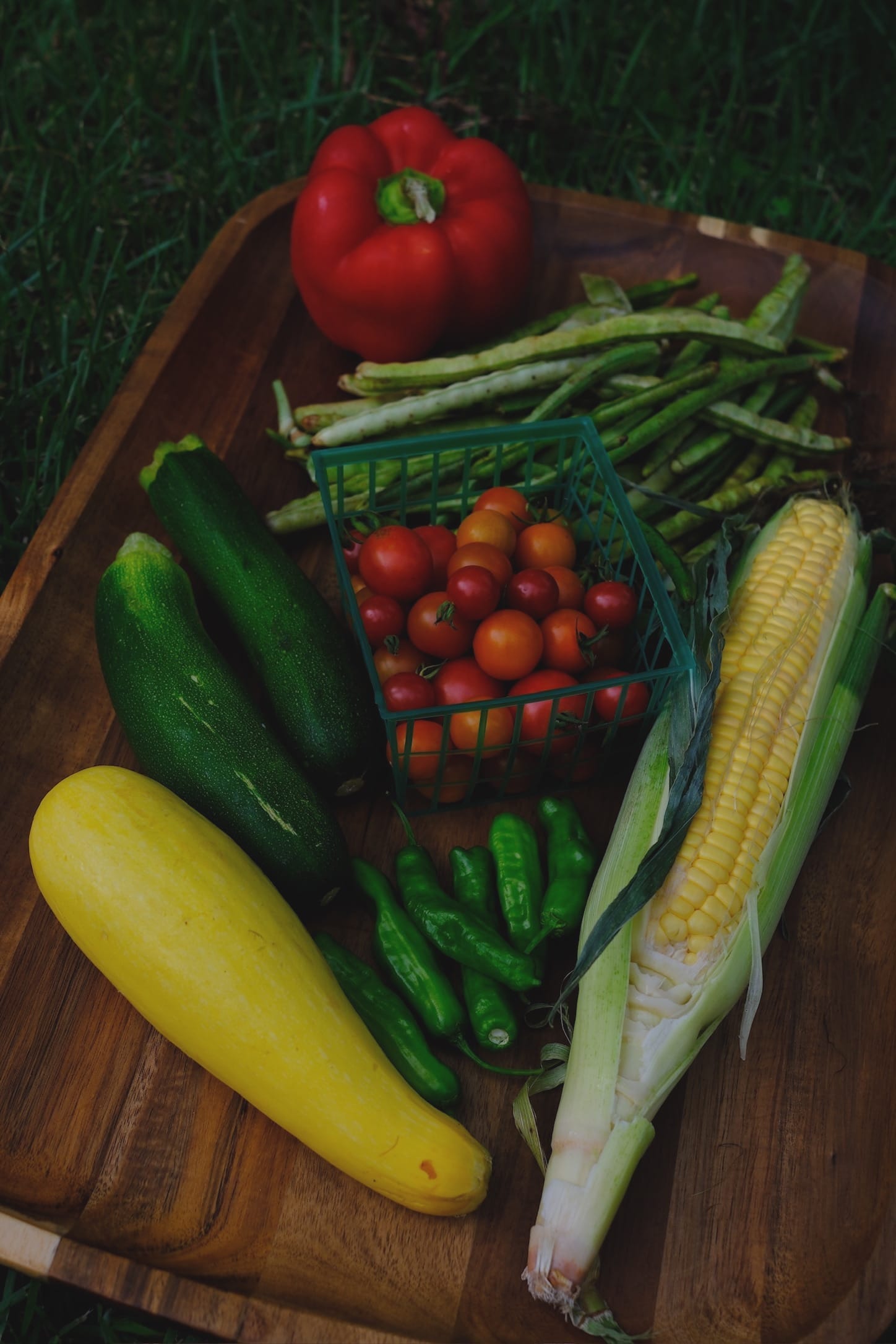 September has always been a month that I wished was the beginning of Autumn, but in practice, it very much was still summer. This year though, there is a genuine crisp chill in the air in the morning, and it occurs to me that the plentiful produce of summer will very soon give way to a heartier fall garden. I look forward to the shift, but I am already grieving the end of my tomatoes and peppers prematurely. Which is silly, considering I still have plenty of time to enjoy them and in fact I am pretty much overwhelmed by them at this moment. This recipe is a true celebration of the bounty of September, with squash, corn, tomatoes, peppers, beans, zucchini, and fresh herbs. And honestly, it has no right to be so delicious considering it is just a big pot of mixed vegetables (and butter). If you want to make this a little bit heartier, I am sure a slice of good bread and butter with some fresh cracked salt & pepper would really set this over the edge. However, the vegetables and chicken make a fantastic meal on their own.