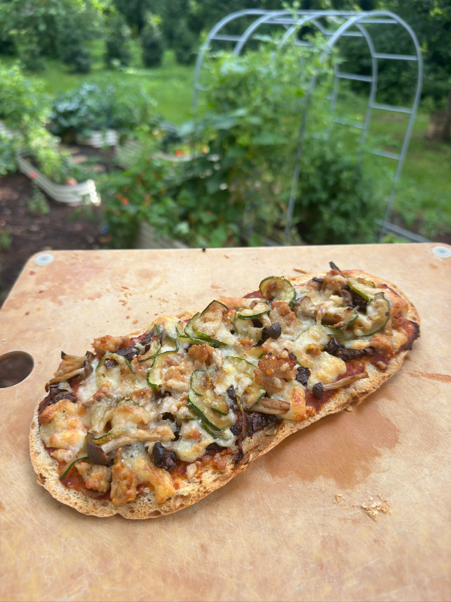 If there is one vegetable this time of year that starts to inundate you, it would be zucchinis. I am very grateful for the steady supply, though. It's nice to have a reliable crop to pad your weekly meals. If I get tired of any vegetable, the best thing is to make it a topping on what is essentially pizza. I get fresh baked naan from the farmer's market to make this meal even simpler.
