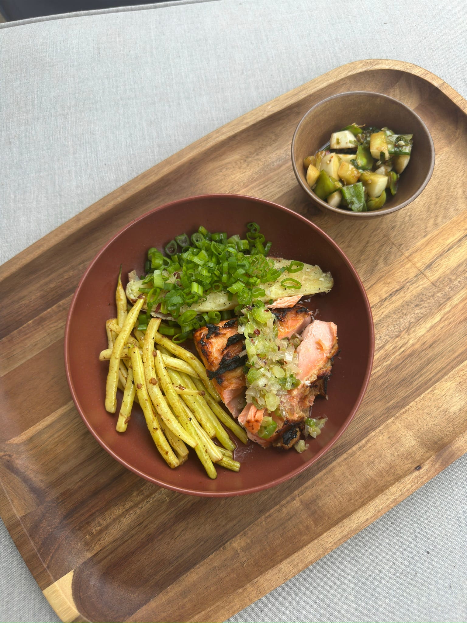- Miso Salmon, Bush Beans, & Japanese Sweet Potato with Scallion Chimichurri